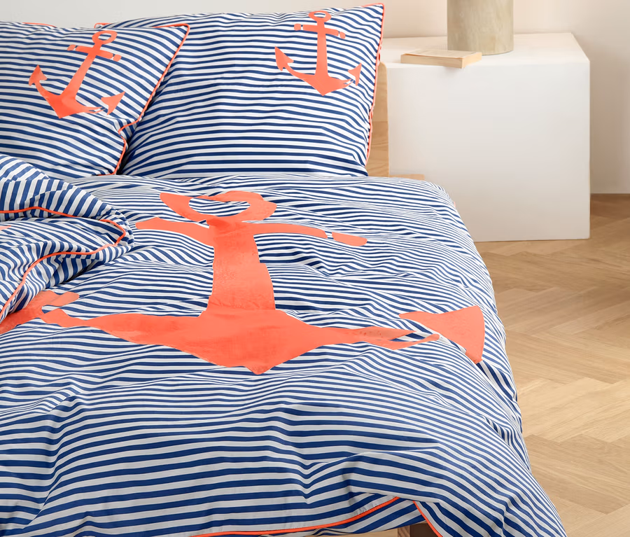 1 côté rayé bleu et blanc avec motif d’ancre corail, 1 côté rayé bleu et blanc