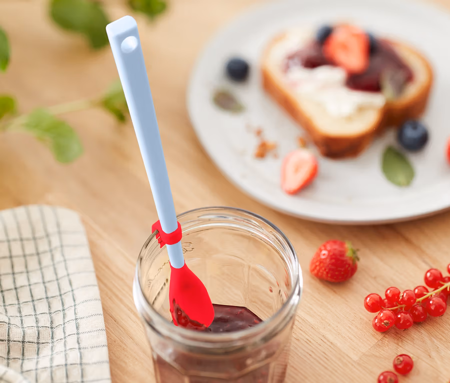 - Avec cuilleron spécial en silicone élastique pour vider les pots de confiture sans laisser de restes par exemple
