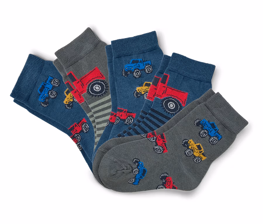 - 2 x bleu foncé avec motif camion multicolore tricoté, 1 x rayé bleu foncé-bleu avec motif camion tricoté, 1 x rayé vert foncé-gris-vert avec motif camion tricoté, 1 x vert foncé avec motif camion multicolore tricoté