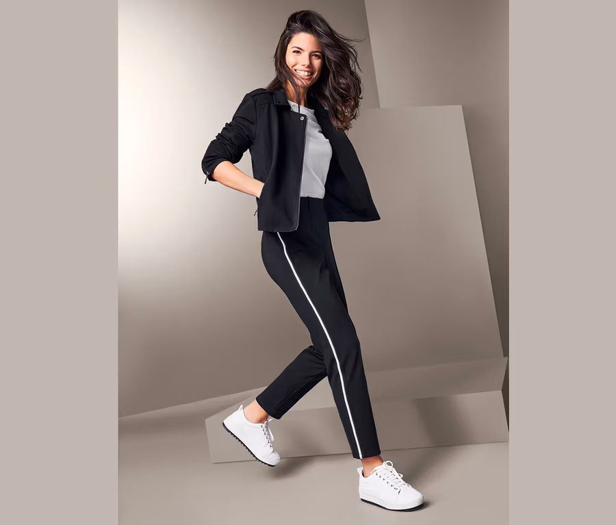 Le galon contrasté sur les coutures latérales crée un look moderne. La taille confortable et élastique est équipée de passants de ceinture. Le pantalon indéformable pour femmes contient de l’élasthanne et séduit par son grand confort à tout moment.