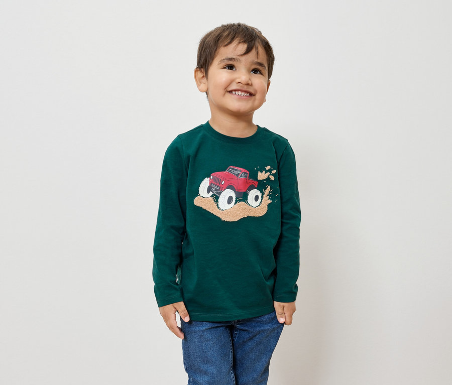 - 1 x vert foncé avec motif camion appliqué, 1 x rayé multicolore
