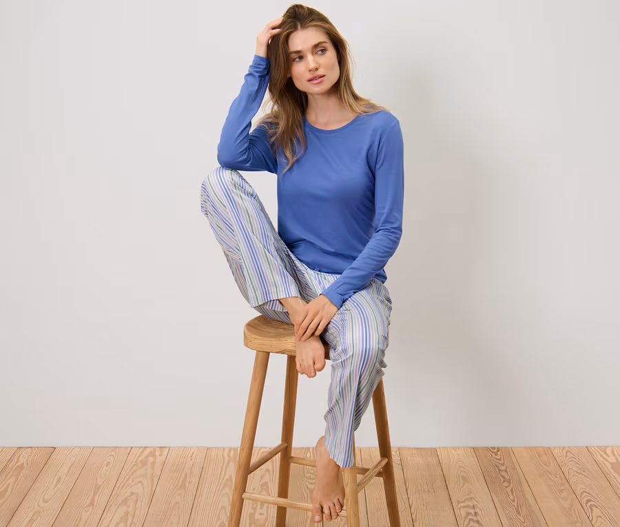 - Pantalon crème, vert clair, bleu et violet à rayures