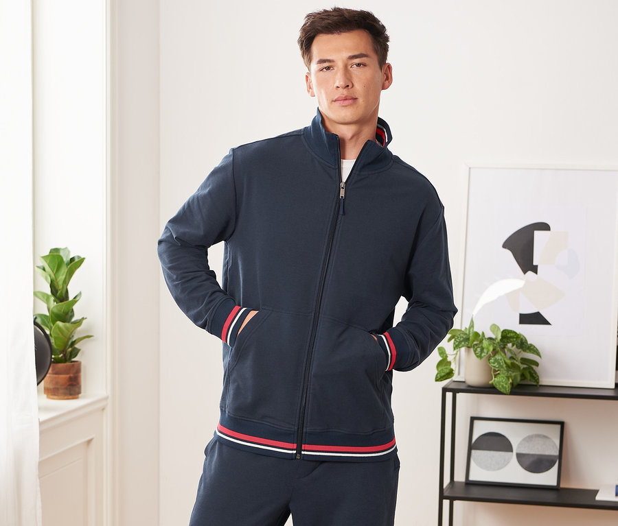 • Bords côtelés tricotés au col, aux manches et à la base, avec des bandes contrastées