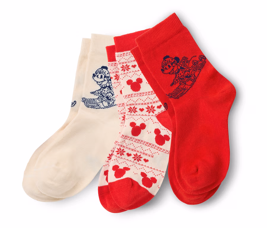 1x beige avec motif norvégien rouge, 1x rouge avec motif tricoté Minnie Mouse bleu foncé, 1x beige avec motif tricoté Minnie Mouse bleu foncé
