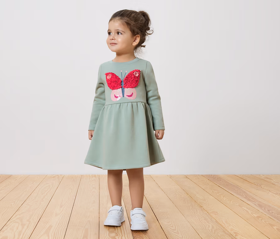 Robe en sweat pour enfant, gris-vert avec application de papillons