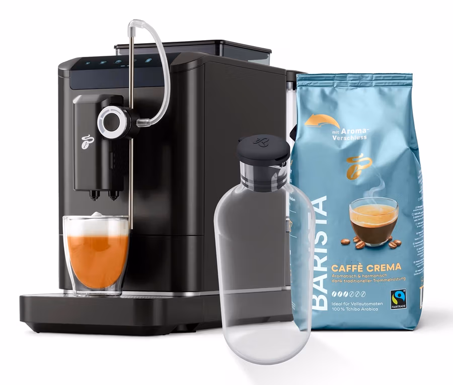 - Kit composé d’une machine à café automatique Tchibo Esperto2 Milk noir granit, d’un pichet à lait en verre borosilicate et d’un kilo de BARISTA Caffè Crema
